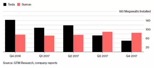 而其競(jìng)爭(zhēng)對(duì)手SunRun公司,則在2017年第四季度以85兆瓦的安裝量領(lǐng)先美國戶用光伏市場(chǎng)。這并非SunRun首次超越SolarCity,在前一季度,特斯拉的戶用光伏安裝量同樣不及SunRun。
