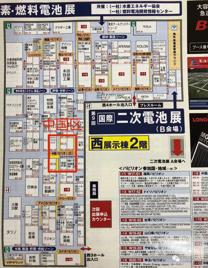 會(huì)場(chǎng)1樓主要為鋰電池展,會(huì)場(chǎng)2樓主要為燃料電池展。從展區(qū)平面圖上我們可以看出,中國(guó)企業(yè)展區(qū)占了很大一部分(這之中不計(jì)未出展中國(guó)企業(yè),但有參加展會(huì)人員)。同時(shí)也可以看出,鋰電池展會(huì)中并沒(méi)有像Panasonic,SONY,GS Yuasa等傳統(tǒng)日本電池企業(yè)的身影,他們干嘛去了?