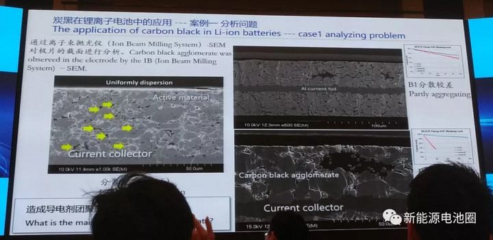 不同BET ,OAN,表面官能團(tuán),結(jié)晶度,結(jié)構(gòu)的炭黑得出的電池循環(huán)差異明顯的原因是導(dǎo)電劑的分散問題-團(tuán)聚(如圖) 材料表面官能團(tuán)的多少決定了炭黑的分散難易程度,越多則相對好分散反之則難以分散。