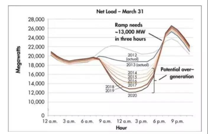 鴨子曲線意味著,傍晚是電力部門的一個緊張時刻,當(dāng)太陽能發(fā)電量下降和電力需求激增同時發(fā)生,太陽能客戶可以在電力部門竭力去實現(xiàn)所需的陡峭斜坡時,通過出力賺取更多的錢。