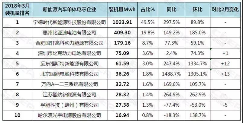 動(dòng)力電池應(yīng)用分會(huì)提供的數(shù)據(jù)顯示,國(guó)內(nèi)動(dòng)力電池企業(yè)3月裝機(jī)量突破2Gwh,產(chǎn)能爬坡正當(dāng)時(shí)。電池中國(guó)網(wǎng)根據(jù)2018年3月動(dòng)力電池企業(yè)裝機(jī)量排位前