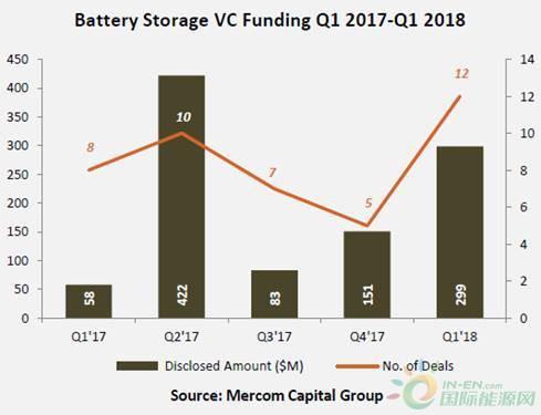 Mercom Capital今天發(fā)布了其關(guān)于電池、智能電網(wǎng)和能效融資的季度報告。該報告發(fā)現(xiàn),在2018年第一季度,電池公司的風(fēng)險資本投資同比增長5倍,達(dá)到2.99億美元。這2.99億美元是儲能電池公司12輪的風(fēng)險融資資金。其中最主要的是電池集成商Stem,它在D輪融資從Activate Capital獲得了8000萬美元的啟動資金。