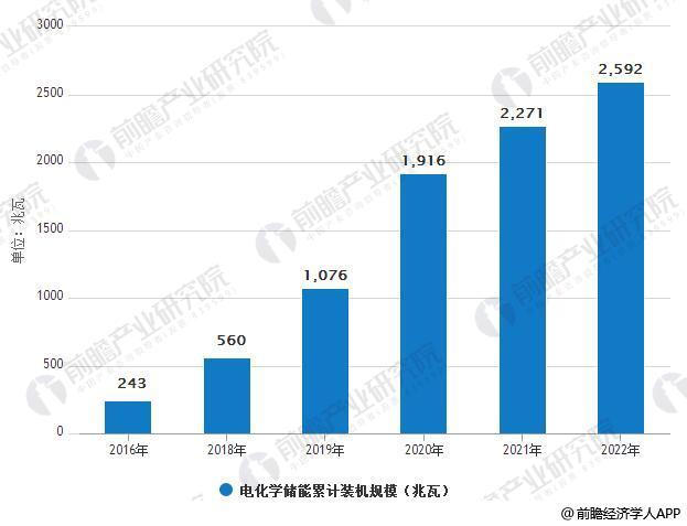 2016年,我國電化學(xué)儲能累計裝機規(guī)模為243兆瓦,同比增長72%。預(yù)計到2018年我國電化學(xué)儲能累計裝機規(guī)模將達到560兆瓦,未來五年(2018-2022)年均復(fù)合增長率約為46.67%,2022年裝機規(guī)模將達到2592兆瓦。