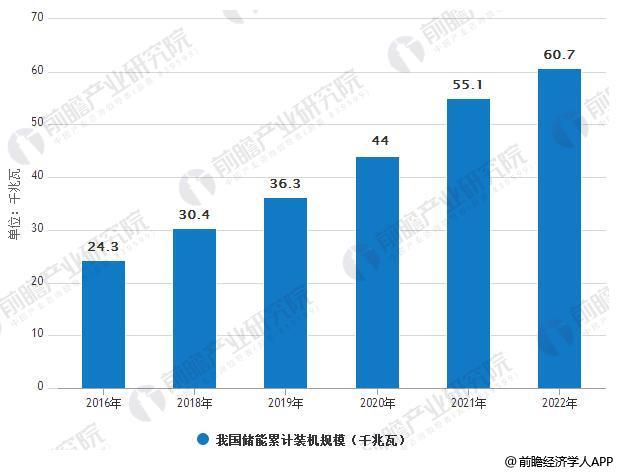 2016年,我國儲能累計裝機規(guī)模為24.3千兆瓦,同比增長4.7%。預(yù)計到2018年我國儲能累計裝機規(guī)模將達到30.4千兆瓦,未來五年(2018-2022)年均復(fù)合增長率約為18.82%,2022年裝機規(guī)模將達到60.7千兆瓦。