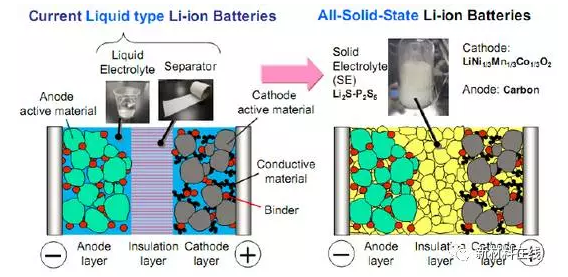 目前商業(yè)化的鋰離子電池電解液是液態(tài)的,因此也被稱為液態(tài)鋰離子電池。簡單來說,全固態(tài)鋰離子電池就是指電池結(jié)構(gòu)中所有部件都是以固態(tài)形式存在,把傳統(tǒng)鋰離子電池的液態(tài)電解液和隔膜替換為固態(tài)電解質(zhì)。