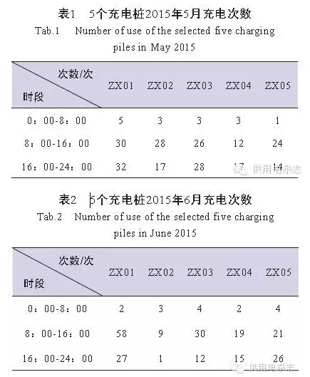 表1~表3為5個充電樁2015年5月、6月和7月的充電次數(shù),從3個表可以看出,電動小汽車在辦公區(qū)的公用充電樁上充電主要是8:00-16:00和16:00-24:00這兩個時段較多,0:00-8:00時段充電的較少。分析原因主要是電動私家車晚上回家后一般在家用充電樁上充滿電,電動出租車晚上一般在充電站里充電,所以公用充電樁0:00-8:00時段用的較少。