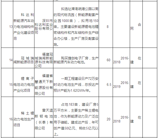 新能源汽車產業(yè)重點項目表