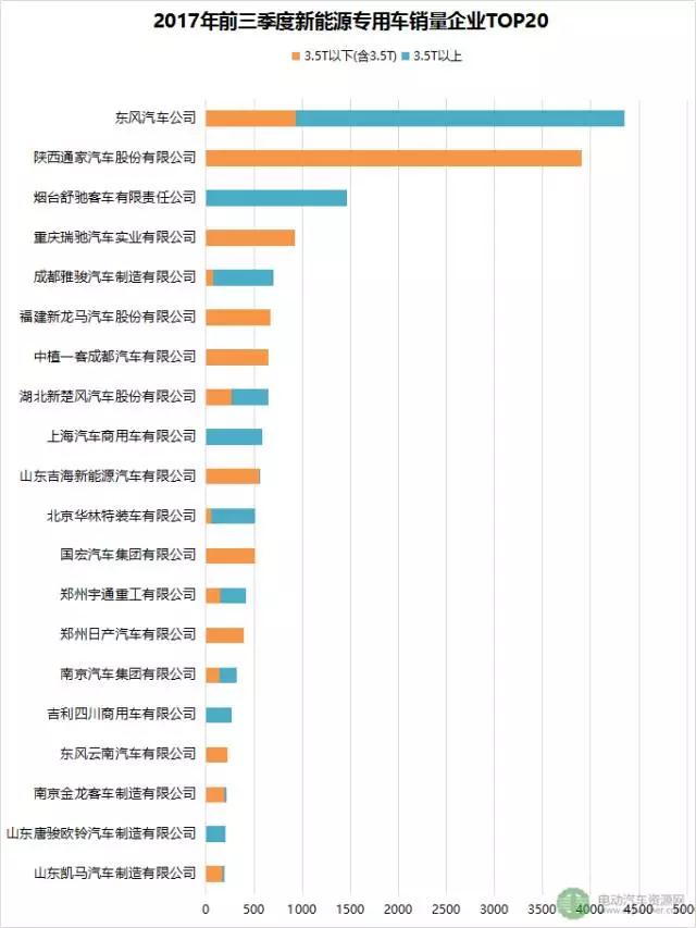 前三季度,3.5T以下(含3.5T)的新能源專用車銷量最多的企業(yè)為陜西通家,交付了3902臺(tái),之后為東風(fēng)汽車、重慶瑞馳、福建新龍馬、中植一客、山東吉海、國(guó)宏汽車,銷量在500臺(tái)以上;3.5T以上的新能源專用車銷量最多的企業(yè)是東風(fēng)汽車,交付了3422臺(tái),之后為煙臺(tái)舒馳、成都雅駿、上海汽車商用車,銷量在500臺(tái)以上。