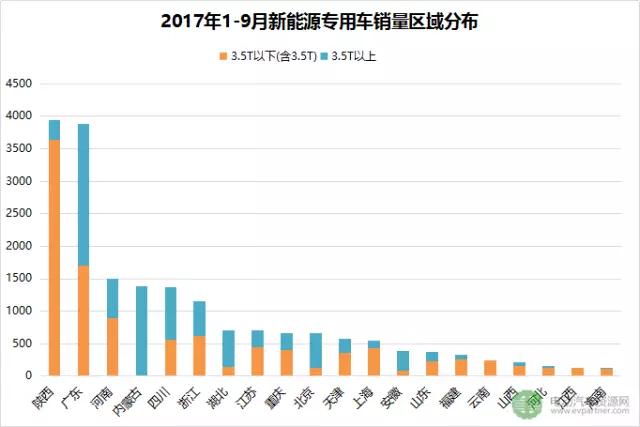 前三季度,3.5T以下(含3.5T)的新能源專用車銷量最多的省份為陜西,交付了3632臺(tái),之后為廣東、河南、浙江、四川,銷量在500臺(tái)以上;3.5T以上的新能源專用車銷量最多的省份是廣東,交付了2181臺(tái),之后為內(nèi)蒙古、四川、河南、湖北,銷量在500臺(tái)以上。