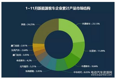 從1-11月累計(jì)產(chǎn)量看,宇通客車?yán)^續(xù)保持優(yōu)勢(shì)地位,是目前唯一一個(gè)累計(jì)產(chǎn)量過萬的企業(yè),占比也提升到了23.13%。此外1~11月新能源客車?yán)塾?jì)產(chǎn)量超過五千臺(tái)的還有比亞迪和中通客車,分別為5806臺(tái)和5153臺(tái)。