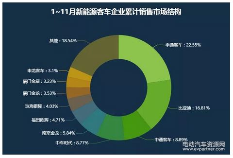 企業(yè)表現(xiàn)來看,2017年1~11月,宇通客車和比亞迪兩家前11月的累計(jì)銷量都超過了1萬臺(tái),占比分別為22.55%和16.81%;中通客車與中車時(shí)代為第二梯隊(duì),銷量在6千臺(tái)以上,占比分別為8.89%和8.77%;南京金龍、福田歐輝、珠海銀隆、廈門金龍等為第三梯隊(duì),銷量均在5千臺(tái)以下。