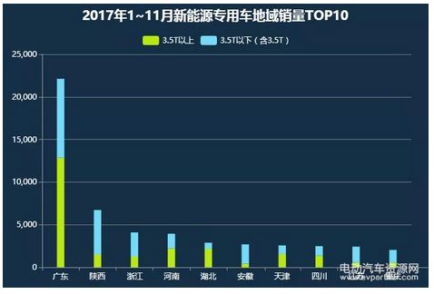 從銷售區(qū)域看,2017年1-11月,廣東地區(qū)銷售新能源專用車最多,達到22116臺。前11月銷售新能源專用車在2000臺以上的共10個省市,分別為:廣東、陜西、浙江、河南、湖北、安徽、天津、四川、江蘇、重慶。