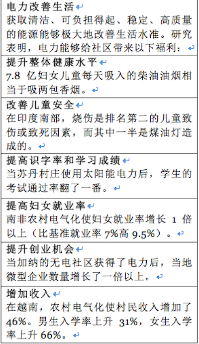 少量的電力都能對(duì)人民生活和經(jīng)濟(jì)發(fā)展產(chǎn)生巨大影響,”參與SEED項(xiàng)目的落基山研究所董事Eric Wanless如是說。有了電力,孩子們就能夠在晚上繼續(xù)學(xué)習(xí);企業(yè)能夠在天黑后繼續(xù)運(yùn)行,這能夠?yàn)槠髽I(yè)帶來更多經(jīng)濟(jì)機(jī)會(huì),員工也能夠在工作一天后有時(shí)間去購買日常用品;面粉廠等在電力的驅(qū)動(dòng)下能夠以更快速度和更低成本提供更有效率的服務(wù)。
