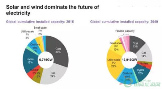 根據(jù)預測,2040年太陽能光伏將成為主導能源之一,占全球發(fā)電總裝機的32%;風電14%、水電12%、煤電14%、天然氣13%、核電3%。