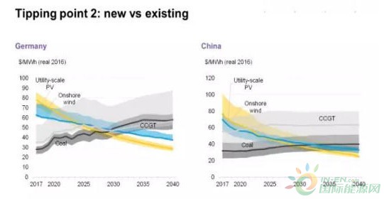 第二個臨界點是:新建的風電、光伏電站的發(fā)電成本低于現(xiàn)有煤電、天然氣電站的運行成本。這個臨界點將比人們想象的更快到來。在中國,預計2030年光伏成本將低于已有的煤電運行成本;在美國,光伏成本將從2027年起低于已有天然氣發(fā)電廠的運行成本;在德國,陸上風電、光伏成本將在2027-2030年之間低于煤電、天然氣發(fā)電廠的運行成本。
