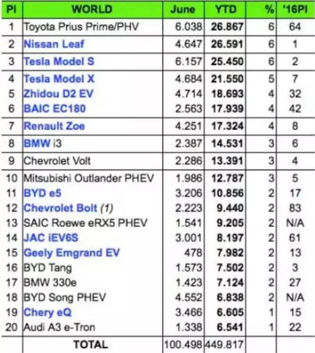 全球純電動(dòng)汽車(chē)銷量排名,車(chē)型排名統(tǒng)計(jì)的是純電動(dòng)汽車(chē)和插電式混合動(dòng)力汽車(chē)放在一起的結(jié)果,所以上半年全球賣(mài)的最好的電動(dòng)車(chē)型竟然是豐田的普銳斯,半年2.7萬(wàn)輛。排名第二是日產(chǎn)聆風(fēng),三四名都是特斯拉的,直到第五名才出現(xiàn)國(guó)產(chǎn)品牌車(chē)型,而且是知豆D2。
