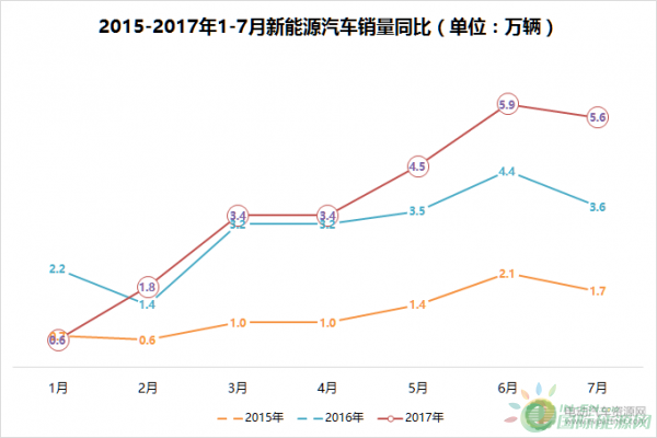 2017年1-7月新能源汽車(chē)?yán)塾?jì)銷(xiāo)售25.1萬(wàn)輛 同比增長(zhǎng)21.5%