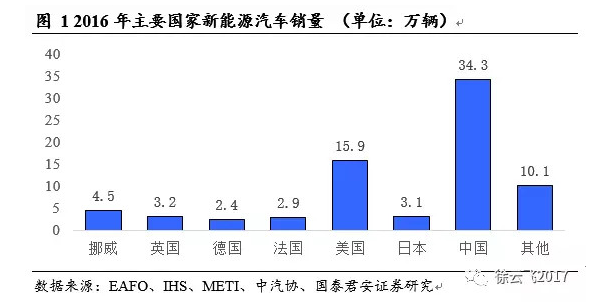 2016年全球新能源汽車市場繼續(xù)快速發(fā)展,市場主要集中在有穩(wěn)定補(bǔ)貼政策的國家。2016年全球累計(jì)銷售新能源汽車77.4萬輛,同比增長40%。銷量排名前七的國家分別是:中國、美國、挪威、英國、日本、法國、德國,合計(jì)銷量達(dá)到63.7萬輛,全球銷量占比83%。從名單里可以看到,大力發(fā)展新能源汽車的國家均為對環(huán)保有著強(qiáng)烈訴求的工業(yè)強(qiáng)國。這些國家推廣新能源汽車的時(shí)間較長,市場比較成熟,補(bǔ)貼政策相對穩(wěn)定,效果明顯。