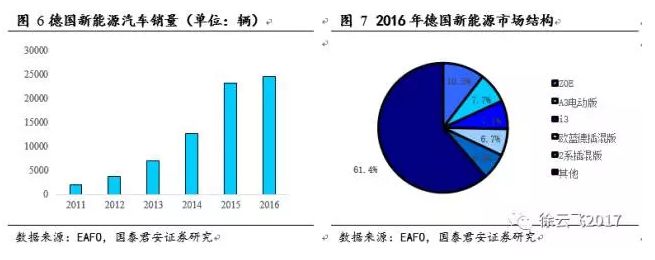 德國政府政策刺激效果明顯,銷量進(jìn)入上升通道。德國政府規(guī)劃到2020年要實(shí)現(xiàn)100萬輛新能源汽車的規(guī)模,一開始政府并沒有實(shí)行補(bǔ)貼政策,德國本地的新能源汽車銷量持續(xù)低迷。2014年底,總理默克爾表示政府將提供包括財(cái)政補(bǔ)貼,稅收減免、加大電池研發(fā)投入等一系列刺激措施已保證政府能夠在2020年完成任務(wù)。受此影響,德國新能源汽車銷量2015年大增,2016年德國開始正式進(jìn)行車價(jià)補(bǔ)貼,市場反應(yīng)并不強(qiáng)烈。德國本土車企在新能源汽車領(lǐng)域比較保守,投放產(chǎn)品市占率過低,整個(gè)市場對新能源汽車的接受度并不高。隨著奔馳、寶馬、大眾等車企逐漸重視新能源汽車,德國新能源汽車市場前景廣闊。