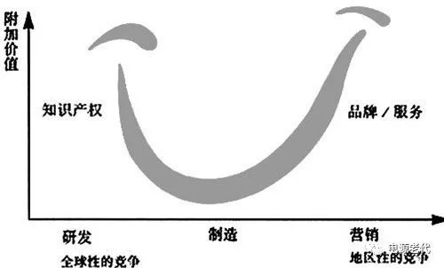 微笑嘴型的一條曲線,兩端朝上,在產(chǎn)業(yè)鏈中,附加值更多體現(xiàn)在兩端,設(shè)計(jì)和銷售,處于中間環(huán)節(jié)的制造附加值最低。微笑曲線中間是制造;左邊是研發(fā),屬于全球性的競(jìng)爭(zhēng);右邊是營(yíng)銷,主要是當(dāng)?shù)匦缘母?jìng)爭(zhēng)。當(dāng)前制造產(chǎn)生的利潤(rùn)低,全球制造也已供過于求,但是研發(fā)與營(yíng)銷的附加價(jià)值高,因此產(chǎn)業(yè)未來應(yīng)朝微笑曲線的兩端發(fā)展,也就是在左邊加強(qiáng)研展創(chuàng)造智慧財(cái)產(chǎn)權(quán),在右邊加強(qiáng) 客戶導(dǎo)向的營(yíng)銷與服務(wù)。