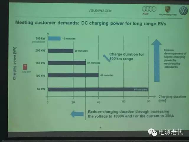 未來的方向是往高電壓、大功率方向走,歐洲車企很早就提出了這個(gè)方向,下面是大眾公司的路標(biāo):