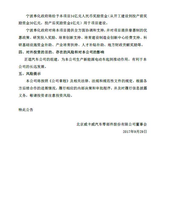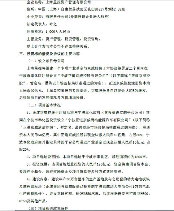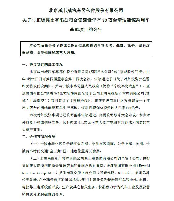 9月29日,北京威卡威汽車零部件股份有限公司(簡(jiǎn)稱“京威股份”)官方網(wǎng)站發(fā)布公告稱,公司于2017年9月27日召開(kāi)第四屆董事會(huì)第十四次會(huì)議,審議通過(guò)了《關(guān)于對(duì)外投資并簽署相關(guān)協(xié)議的議案》,并與寧波市奉化區(qū)人民政府、正道集團(tuán)有限公司(香港)在大陸境內(nèi)的全資子公司上海星控資產(chǎn)管理有限公司(簡(jiǎn)稱“上海星控”)共同簽訂了《投資協(xié)議》,將在寧波市奉化區(qū)投資建設(shè)一個(gè)年產(chǎn)30萬(wàn)臺(tái)的清潔能源整車生產(chǎn)基地,該項(xiàng)目規(guī)劃總投資約人民幣170億元,規(guī)劃用地約1800畝。