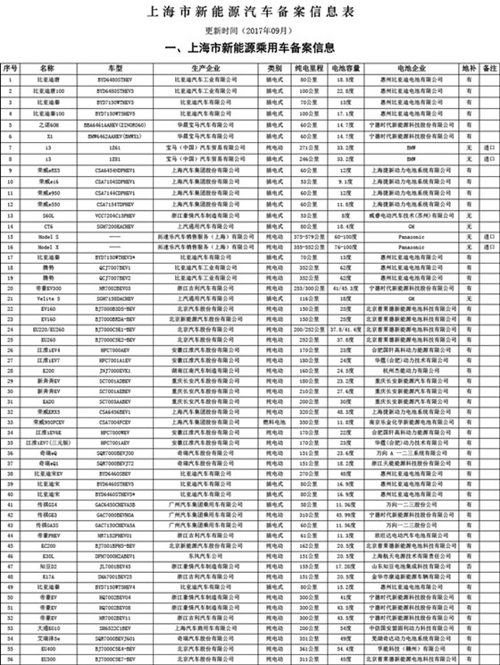 上海經(jīng)信委發(fā)布9月份新能源汽車備案目錄