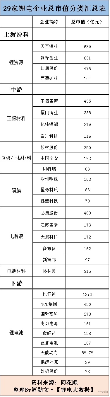 ①從整體情況來看:總市值超500億的鋰電企業(yè)共3家,其中下游企業(yè)比亞迪以總市值1872億元遙遙領(lǐng)先,值得注意的比亞迪1家的總市值遠(yuǎn)超同類別TCL等8家企業(yè);另外2家均為鋰電池上游企業(yè),為天齊鋰業(yè)、贛鋒鋰業(yè);總市值超過100億的企業(yè)有22家。