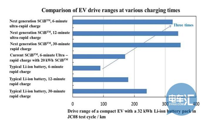 根據(jù)上面的圖表,傳統(tǒng)鋰電子電池要充30分鐘才能達(dá)到的電量,新一代電池僅需6分鐘都不到,東芝測試的電動車?yán)眠@六分鐘的充電跑了320公里(199英里)。