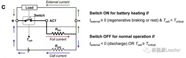 該技術(shù)的核心是自加熱電池,該電池設(shè)計如上圖所示,需要在電池內(nèi)部置入兩片Ni片,每片Ni片的阻抗為78mW,分別放置在電池的1/4和3/4厚度處,兩片Ni片之間以并聯(lián)形式連接在一起,并通過一個開關(guān)與正負(fù)極連接在一起,用于控制鋰離子電池的是否加熱。Guangsheng Zhang在上述自加熱電池的基礎(chǔ)上設(shè)計了控制方案,能夠根據(jù)電動汽車的負(fù)載情況控制加熱開關(guān)的開啟和關(guān)閉。