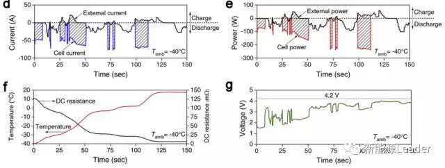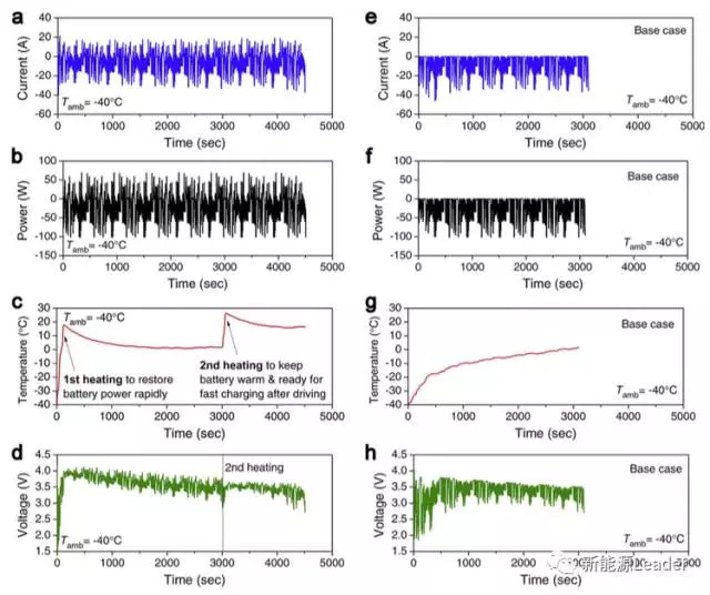 下圖為使用自加熱電池和使用普通電池的對照組在-40℃下使用過程中的電流、功率、電池溫度和電池電壓等數(shù)據(jù)曲線,其中左邊為采用自加熱電池的實驗組,右邊為空白對照組。從電池溫度上看(圖c實驗組,圖g對照組),自加熱電池的溫度升高速度要遠(yuǎn)遠(yuǎn)快于對照組,實驗組緊緊用了112s就恢復(fù)到了20℃,并且實現(xiàn)了全部的剎車能量的回收,而對照組電池用了3000s,溫度才恢復(fù)到了0℃,從而導(dǎo)致無法回收剎車能量。