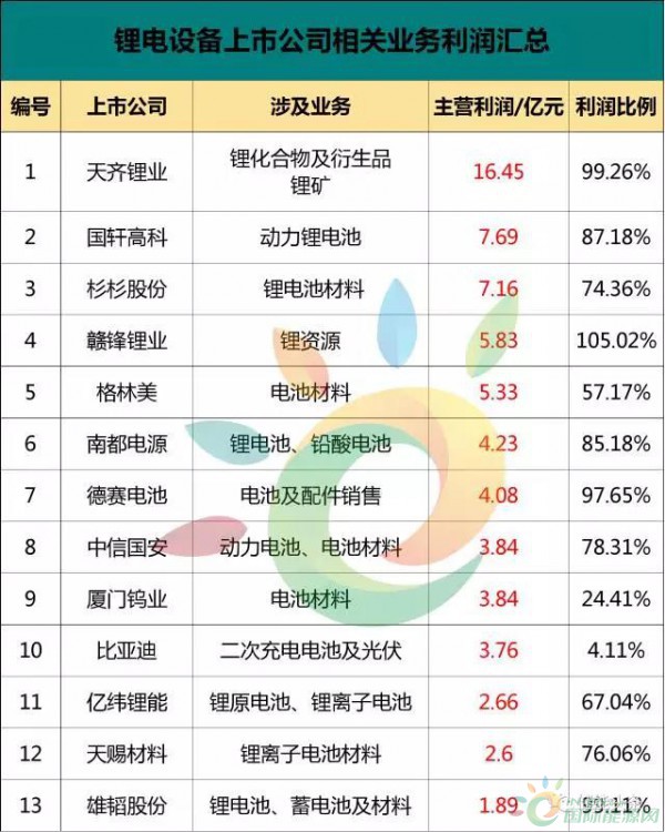 比亞迪、南都、杉杉、天賜等27家鋰電企業(yè)涉及鋰電占比多少?主營利潤有多少?誰是賺錢王