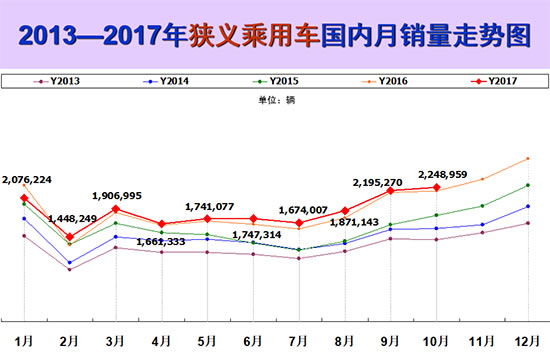 乘聯(lián)會統(tǒng)計,2017年10月我國狹義乘用車銷量為2248959輛,實現(xiàn)同環(huán)比雙增,依然延續(xù)了近3年來“金九銀十”的特征。乘聯(lián)會秘書長崔東樹表示,雖然經(jīng)濟(jì)減速跡象顯現(xiàn),且有中秋節(jié)影響產(chǎn)銷,但10月汽車銷量環(huán)比增長仍超過預(yù)期。