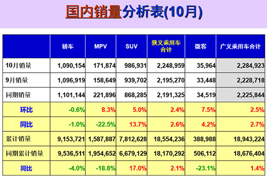 10月狹義乘用車銷量為2248959輛,同比增長2 6%,環(huán)比增幅為2 4%。崔東樹分析認(rèn)為,10月乘用車持續(xù)走高主要是因為購置稅優(yōu)惠政策推動年末銷量。此外,房價暴漲后受控企穩(wěn),以及車企決戰(zhàn)4季度的決心也推動10月車市