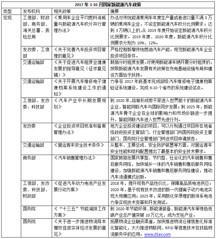 2017年1-10月,國(guó)家累計(jì)出臺(tái)32項(xiàng)新能源汽車(chē)相關(guān)政策(包括征求意見(jiàn)稿5項(xiàng)),涉及到宏觀、補(bǔ)貼、基礎(chǔ)設(shè)施、安全管理、技術(shù)研發(fā)、智能網(wǎng)聯(lián)等諸多方面。