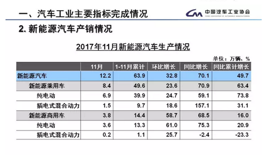 12月11日,中國汽車工業(yè)協(xié)會召開信息發(fā)布會,公布了2017年11月份中國汽車工業(yè)經(jīng)濟(jì)運(yùn)行情況。其中,新能源汽車11月份產(chǎn)銷量均高于去年同期。