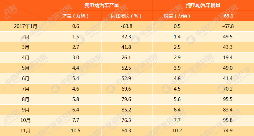 2017年11月中國(guó)純電動(dòng)汽車產(chǎn)銷量