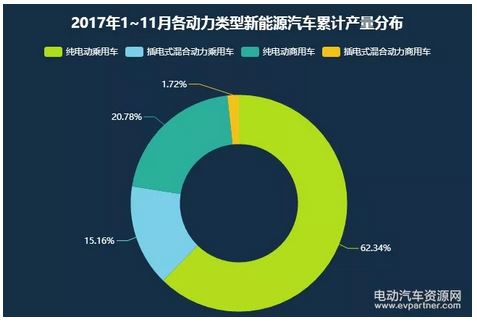 從動力類型新能源汽車?yán)塾?jì)產(chǎn)量的分布情況來看,基本與銷量分布情況保持一致,2017年1~11月,純電動乘用車?yán)塾?jì)生產(chǎn)39.9萬臺,占比62.34%,同比累計(jì)增長73.8%;插電式混合動力乘用車?yán)塾?jì)生產(chǎn)9.7萬臺,占比15.16%,同比累計(jì)增長31.1%;純電動商用車?yán)塾?jì)生產(chǎn)13.3萬臺,占比20.78%,同比累計(jì)增長20.9%;插電式混合動力商用車?yán)塾?jì)生產(chǎn)1.1萬臺,占比1.72%,同比累計(jì)減少23.3%。
