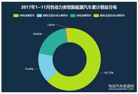 從動力類型來看,2017年1~11月,純電動乘用車?yán)塾?jì)銷售38.2萬臺,占比62.73%,同比累計(jì)增長76.0%;插電式混合動力乘用車?yán)塾?jì)銷售13.3萬臺,占比15.43%,同比累計(jì)增長29.8%;純電動商用車?yán)塾?jì)銷售12.2萬臺,占比20.03%,同比累計(jì)增長23.2%;插電式混合動力商用車?yán)塾?jì)銷售1.1萬臺,占比1.81%,同比累計(jì)減少21.5%。