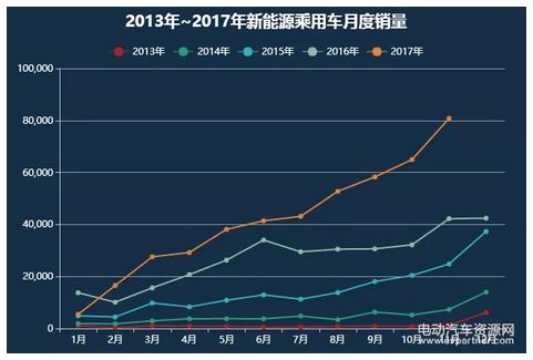 根據(jù)乘聯(lián)會廠家數(shù)據(jù),11月新能源乘用車銷量達(dá)到8.1萬臺,環(huán)比10月增長1.6萬臺,同比增速87%,實(shí)現(xiàn)了2017年保持連續(xù)10個月的月度環(huán)比持續(xù)增長態(tài)勢。數(shù)據(jù)顯示,今年前11月新能源乘用車銷售近46萬臺。