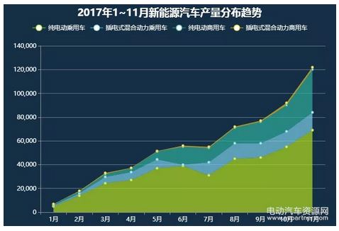 產(chǎn)量方面,2017年11月,新能源乘用車的產(chǎn)量為8.4萬輛,其中純電動乘用車6.9萬輛,插電式混合動力乘用車1.5萬輛;新能源商用車產(chǎn)量為3.8萬輛,其中純電動商用車3.6 萬輛,插電式混合動力商用車0.2萬輛。