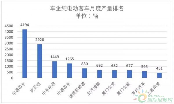 車企方面,就11月產(chǎn)量來(lái)說(shuō),宇通、比亞迪、中車電動(dòng)分別以4194輛、2926輛、1449輛排名前三,中通客車以單月產(chǎn)量1265輛排名第四。從單月產(chǎn)量水平看,只有前四強(qiáng)產(chǎn)量過(guò)千,銀隆、北汽福田等產(chǎn)量均在千輛以下。