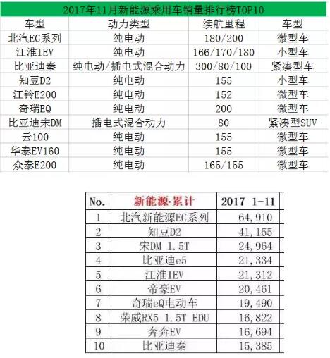 數(shù)據(jù)顯示,2017年10月全球新能源銷(xiāo)量增長(zhǎng)再創(chuàng)新高,超過(guò)12萬(wàn)輛,達(dá)到120912輛,同比增長(zhǎng)84%,1-10月累計(jì)銷(xiāo)量達(dá)到888400輛,同比增長(zhǎng)51%。(11月新能源汽車(chē)銷(xiāo)量排行,小編只找到了國(guó)產(chǎn)車(chē)榜單,如下)下面盤(pán)點(diǎn)一下