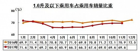 按照不同的購(gòu)置稅率來(lái)看,小排量市場(chǎng)銷量可以分為兩大階段。2017年全年購(gòu)置稅率為7.5%,根據(jù)目前中汽協(xié)公布的數(shù)據(jù)顯示,2017年前11月,1.6升及以下乘用車?yán)塾?jì)銷售1513.7萬(wàn)輛,同比下降2%,占乘用車銷量比重為68.5%,同比下降2.7個(gè)百分點(diǎn)。