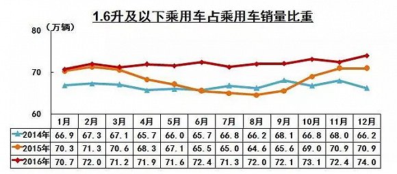 2017年1.6升及以下排量乘用車購(gòu)置稅優(yōu)惠政策對(duì)于車市整體刺激有限。但根據(jù)中汽協(xié)2016年銷量數(shù)據(jù)來(lái)看,2016年1.6升及以下排量乘用車銷售1760.7萬(wàn)輛,同比增長(zhǎng)21.4%,高于乘用車總體增速6.5個(gè)百分點(diǎn),占乘用車銷量比重為72.2%,比上年同期提高3.6個(gè)百分點(diǎn)。對(duì)乘用車銷量的貢獻(xiàn)度為97.9%。整體銷量走勢(shì)均高于2015年同期銷量,可以說(shuō)購(gòu)置稅的優(yōu)惠刺激性作用在2016年全年發(fā)揮明顯。這在某種程度上提前透支2017年小排量乘用車的銷量。