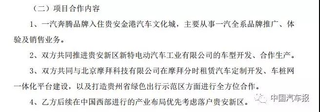 值得一提的是一汽轎車與新特電動(dòng)汽車間的合作。據(jù)媒體報(bào)道,在1月7日一汽轎車正式對(duì)外發(fā)布與新特電動(dòng)汽車簽約的公告中,兩家公司的具體合作內(nèi)容為: