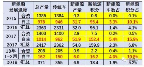 17年1-12月的新能源車銷量占比2.3%,較16年全年的1.4%有了大幅改善提升,18年的1-2月新能源車銷量占達(dá)到1.9%。其中合資企業(yè)的改善較小,18年自主產(chǎn)量6萬臺,表現(xiàn)較強(qiáng)。