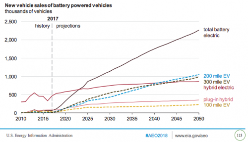 美國能源情報局的《年度能源展望匯報》也預測了2018年電動車的銷量會增加:電動車占汽車總銷售量的比例將從2017年的不到1%,增加到2050年的12%。