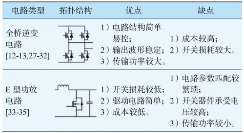 現(xiàn)有研究中,用于電動(dòng)汽車(chē)無(wú)線充電系統(tǒng)的功放電路拓?fù)浣Y(jié)構(gòu)主要包括全橋逆變電路和E型功放電路,其拓?fù)浣Y(jié)構(gòu)及優(yōu)缺點(diǎn)在表 2 中列出。
