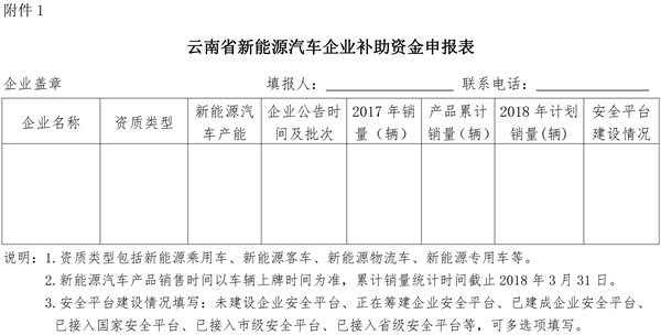 4.《云南省新能源汽車企業(yè)補助資金申報表》(附件1);